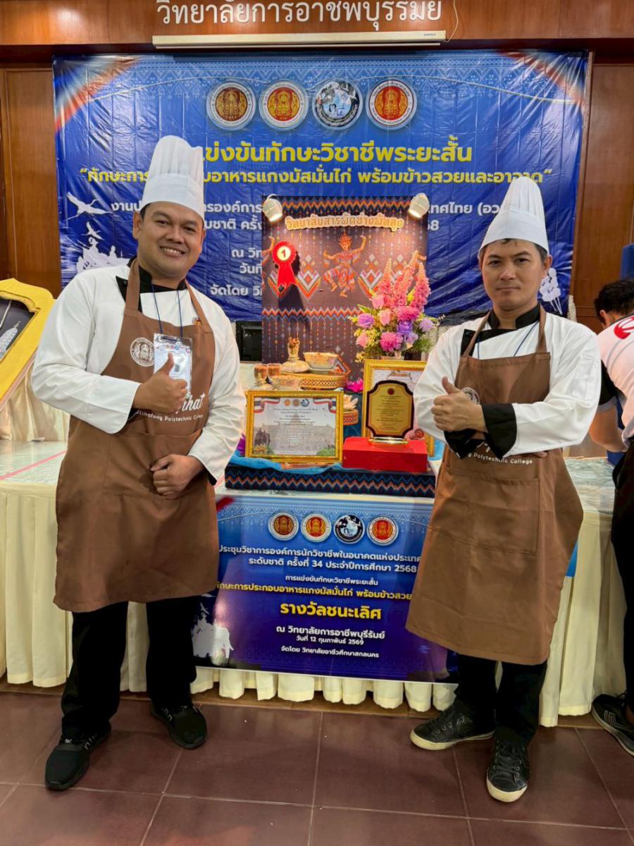 นายภาณุวัฒน์ บุญยะรัตน์ ผู้อำนวยการวิทยาลัยสารพัดช่างพัทลุง มอบหมายให้นายรังสิมันส์ สายชลเชี่ยว ครูประจำแผนกวิชาอาหารและโภชนาการ (ครูผู้ควบคุม) ???? เข้าร่วมแข่งขันทักษะหลักสูตรวิชาชีพระยะสั้น สาขาวิชาอาการและโภชนาการ (งานอาหาร) ทักษะการประกอบอาหาร ?แกงมัสมั่นไก่ พร้อมข้าวสวย และอาจาด? โดยมีนายนพดล พรพงศ์วิทย์ และนายภูริโชติ นิ่มดำ นักศึกษาหลักสูตรวิชาชีพระยะสั้นแผนกวิชาอาหารและโภชนาการเข้าร่วมการแข่งขัน และในการแข่งขันครั้งนี้ หลักสูตรวิชาชีพระยะสั้นแผนกวิชาอาหารและโภชนาการ วิทยาลัยสารพัดช่างพัทลุง ???? ได้รับรางวัลชนะเลิศ อันดับ 1 ในงานประชุมวิชาการองค์การนักวิชาชีพในอนาคตแห่งประเทศไทย (อวท.) ระดับชาติ ครั้งที่ 36 ประจำปีการศึกษา 2568 S:0