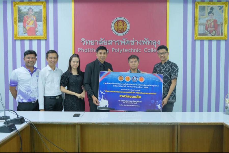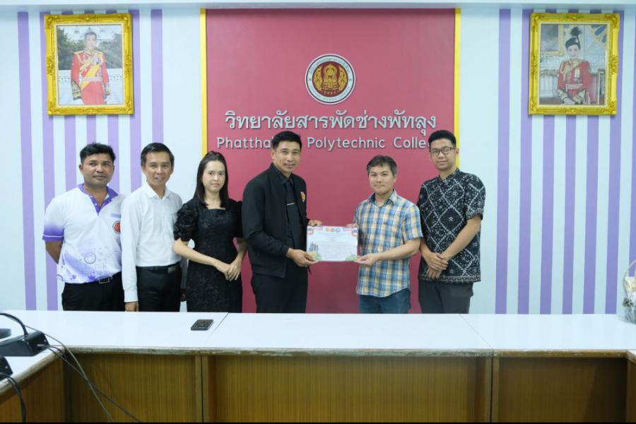 นายภาณุวัฒน์ บุญยะรัตน์ ผู้อำนวยการวิทยาลัยสารพัดช่างพัทลุง พร้อมด้วยคณะบริหารวิทยาลัยสารพัดช่างพัทลุง ร่วมแสดงความยินดีกับนายนพดล พรพงศ์วิทย์ และนายภูริโชติ นิ่มดำ นักศึกษาหลักสูตรวิชาชีพระยะสั้นแผนกวิชาอาหารและโภชนาการ นายรังสิมันส์ สายชลเชี่ยว ครูประจำแผนกวิชาอาหารและโภชนาการ (ครูผู้ควบคุม) ที่ได้รับรางวัล S:0
