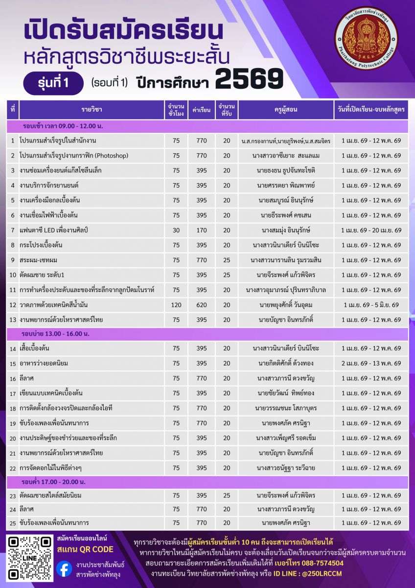 ประกาศ รับสมัครนักเรียนหลักสูตรวิชาชีพระยะสั้น (ประชาชนทั่วไป) รุ่นที่ 1 (รอบที่ 1) ประจำภาคเรียนที่ 1 ปีการศึกษา 2569